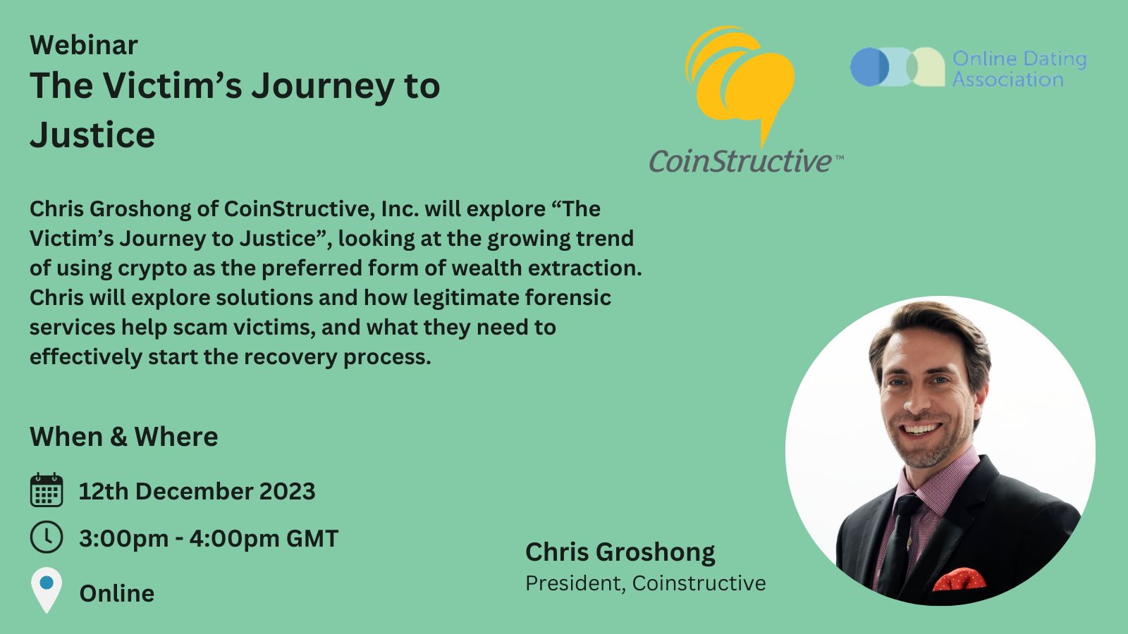 In our final webinar of 2023, Chris Groshong of CoinStructive, Inc. will explore “The Victim’s Journey to Justice”. In his 4+ years of working with victims, all of whom are persuaded into using crypto as the preferred form of wealth extraction, he’s seen a growing trend.