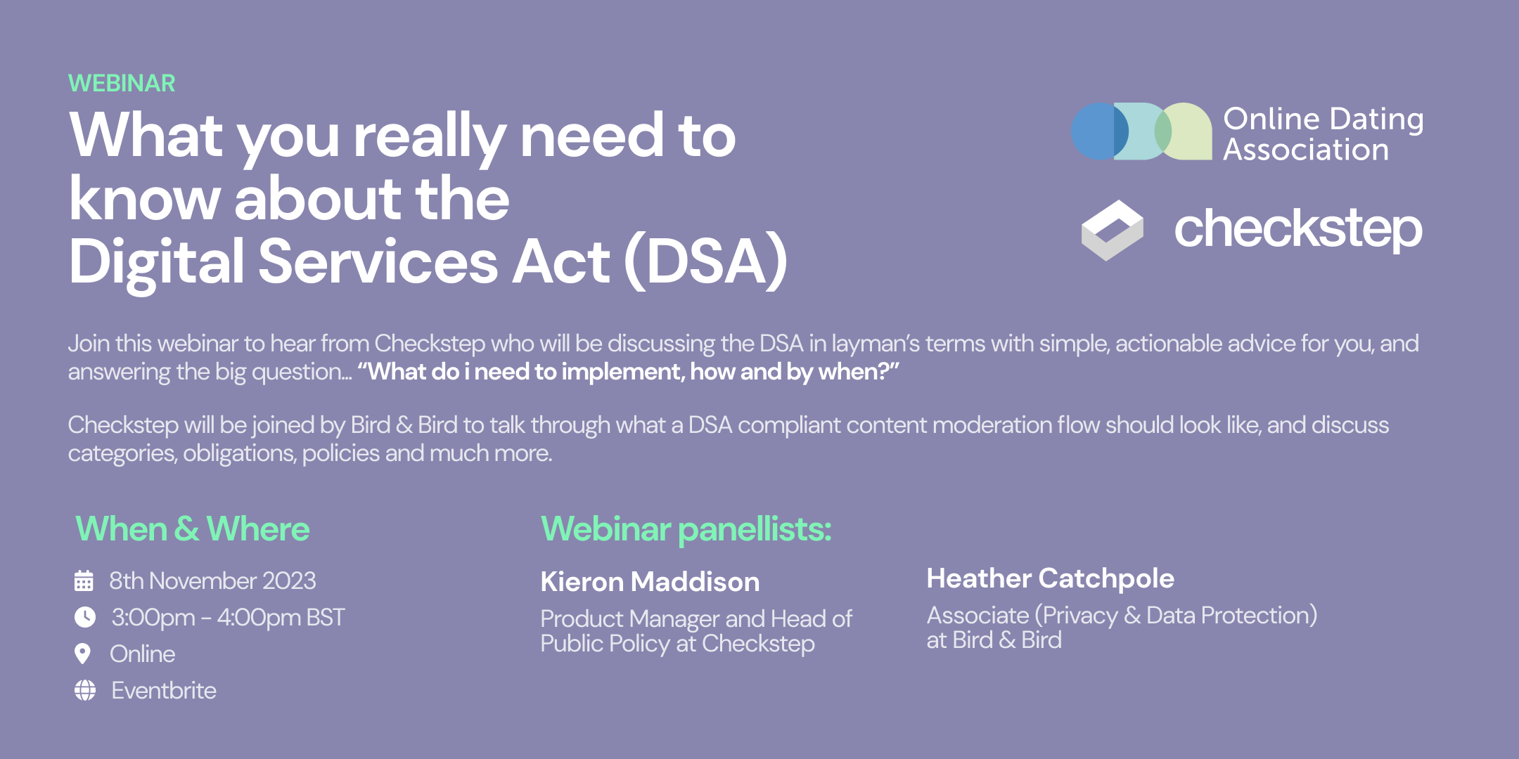 During this webinar, our guests Checkstep and Bird & Bird will be discussing the DSA in layman’s terms with simple, actionable advice for you, and answering the big question …”what do I need to implement, how and by when?”.